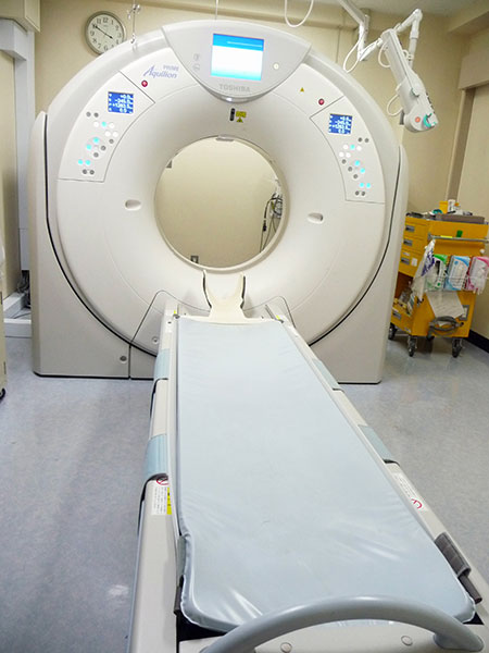 CTとはcomputed tomographyの略で、X線を目的の場所に360度照射し収集したデータをもとにして、いろいろな断面像を作成し可視化することのできる検査です。また得られた画像データから3D画像なども作成することができます。全身のあらゆる部位を撮影することができます。当院では、canonメディカル社製の80列スライスCT「Aquilion PRIME」を導入しており、短時間で高精細な画像を得ることができます。また、被ばく低減に配慮された装置なので、安心して検査を受けて頂くことができます。
