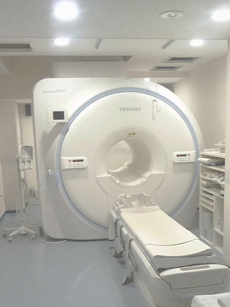 MRIとは、magnetic resonance imagingの略で、強力な磁気と電波を使い検出した生体信号をコンピュータ処理して画像を再構成したものです。MRI検査は、X線などの放射線を使用しないので被ばくの心配はいらない上、全身のあらゆる部位を撮像することができます。当院では、東芝の1.5T MRI「Vantage Elan」を導入しております。この検査は他の検査に比べ検査時間が長く大きな音が出る検査ですが、当院の装置は最大90%以上の音をカットして検査時の騒音を低減しています。ただ、体内金属や近年においてはカラーコンタクトレンズ、タトゥー、保温性の高い下着、ネイル(マグネットを使用したもの)等を装着された方には注意が必要です。